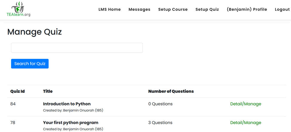 - Scroll down, you will see the created Quiz and note the "Quiz Id"
